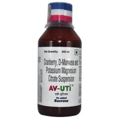 AV UTI SUGAR FREE Suspension 200ml av uti sugar-free suspension 200ml is a pharmaceutical suspension specifically formulated to provide relief from urinary tract infections (utis). This sugar-free suspension offers a palatable solution for patients who require antibiotic therapy for UTIs. The active ingredient, Methenamine, works by producing acid in the urine, which helps to inhibit the growth of bacteria commonly associated with UTIs. This medication should be taken as directed by a healthcare provider to ensure effective treatment and to minimize the risk of adverse effects. It is essential to complete the full course of treatment to eliminate the infection and prevent its recurrence. Always consult with a healthcare professional before starting any new medication.
