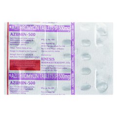 Azumin 500mg Tablet contains Azithromycin, a macrolide antibiotic known for its broad-spectrum action against bacterial infections. It is commonly prescribed for bronchitis, pneumonia, skin infections, and ENT conditions. Its high-strength dosage allows for shorter treatment durations, making it more convenient for patients. Azithromycin works by stopping bacterial protein synthesis, which halts the spread of infection. It is generally well-tolerated and taken once daily under medical guidance. Patients should adhere strictly to the dosage instructions and complete the full course to achieve optimal results and avoid antibiotic resistance.