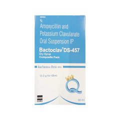 Bactoclav DS 457 Dry Syrup is a double-strength pediatric formulation containing Amoxicillin and Clavulanic Acid, used to treat a wide range of bacterial infections in children. It is effective against respiratory tract infections, ear infections, urinary tract infections, and skin infections. The higher concentration allows for smaller volumes per dose, making it easier for children to take. This dry syrup must be reconstituted with water before use and consumed within the recommended period. Completing the full prescribed course is essential to ensure recovery and prevent antibiotic resistance.