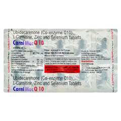 CARNIMAC Q 10 Tablet 10’s carnimac q10 tablets, a potent dietary supplement, contains coenzyme q10 (ubiquinone), a vital nutrient that plays a crucial role in energy production at the cellular level. These tablets are formulated to support heart health, boost energy levels, and aid in the management of oxidative stress. CoQ10 is an antioxidant that helps protect cells from damage caused by free radicals. Each tablet provides 10mg of CoQ10, making it an effective choice for those seeking to maintain overall health and wellness. Carnimac Q10 Tablets are easy to swallow and can be taken daily as part of a balanced diet. Consult your healthcare provider before starting any new supplement regimen.