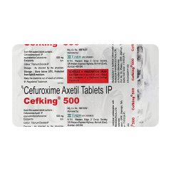 CEFKING 500mg Tablet contains Cefuroxime Axetil, a broad-spectrum antibiotic belonging to the second-generation cephalosporins. It is effective against both Gram-positive and Gram-negative bacteria, making it useful for respiratory infections (bronchitis, pneumonia), urinary tract infections, skin infections, and soft tissue infections. It should be taken after meals for better absorption.