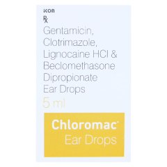 CHLOROMAC Ear Drops 5ml: A potent solution for ear infections, this medication contains the active ingredient Neomycin, Polymyxin B Sulfates, and Hydrocortisone. Designed to treat bacterial infections and inflammation in the ear, it provides relief from symptoms such as itching, pain, and swelling. The 5ml dropper bottle ensures precise dosing for effective treatment. Use as directed by your healthcare provider to maintain ear health and alleviate discomfort.