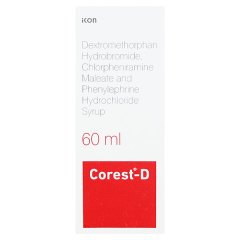 COREST D Syrup 60ml is designed to treat dry and allergic coughs by combining a cough suppressant with antihistaminic effects. It provides quick relief from cough, throat irritation, nasal congestion, and sneezing. The syrup is suitable for both children and adults, and is usually taken under healthcare supervision.