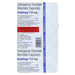 DABITAG 110mg Capsule 10’s dabitag 110mg capsules, a potent pharmaceutical solution, are designed to help manage blood clot-related conditions. Each capsule contains 110mg of the active ingredient, Dabigatran Etexilate, a direct thrombin inhibitor. These capsules are prescribed for patients with atrial fibrillation not caused by a heart valve problem, who have an increased risk of stroke. By selectively blocking the action of thrombin, DABITAG helps prevent dangerous blood clots from forming in the body. This medication is taken orally and is available in packs of 10 capsules for convenient dosing. Consult your healthcare provider for proper usage instructions and potential drug interactions.