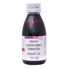 Dotcoff LS Syrup 100ml is a powerful combination used to treat productive cough with mucus. It contains Levosalbutamol to relax bronchial muscles, Ambroxol as a mucolytic to thin mucus, and Guaiphenesin to expel phlegm. This formula eases breathing by clearing airways and reducing cough frequency. Suitable for both children and adults when used under medical supervision.