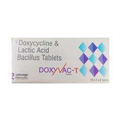DOXYVAC T Tablet 8’s is an oral antibiotic indicated for mild to moderate bacterial infections. Its tablet form ensures accurate dosing and convenient administration. DOXYVAC T works by inhibiting bacterial growth, promoting faster recovery and symptom relief. Suitable for adults, it should be taken strictly as prescribed by a healthcare professional for safe and effective therapy.