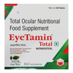 EYETAMIN TOTAL Tablet 10’s eyetamin total tablets, a comprehensive eye health supplement, contains 10 tablets per pack. This formulation, with its unique blend of essential vitamins and minerals, supports overall eye health, including macular health and night vision. The active ingredient, Lutein, Zeaxanthin, and Zinc, work synergistically to help maintain healthy vision and protect against oxidative stress. EYETAMIN TOTAL Tablets are an ideal choice for individuals seeking to safeguard their eye health and promote optimal vision.