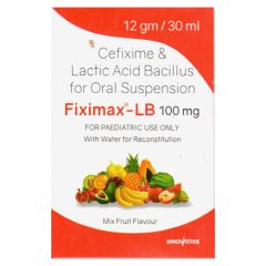 FIXIMAX LB 100MG MIX FRUIT FLAVOUR Oral Suspension 30ml is an antibiotic solution designed for mild bacterial infections. Its palatable fruit flavor ensures easy administration for both children and adults. FIXIMAX LB works by inhibiting bacterial growth, promoting faster recovery and effective symptom relief. Always follow healthcare professional instructions for safe and effective use.