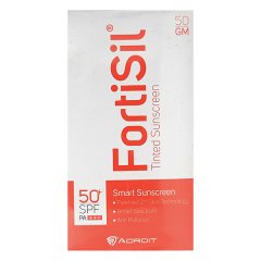FORTISIL SPF 50+ PA+++ TINTED Sunscreen 50gm fortisil spf 50+ pa+++ tinted sunscreen, a 50gm tube, offers broad-spectrum protection against uva and uvb rays. Enriched with a subtle tint, this sunscreen provides effective coverage while minimizing the appearance of uneven skin tone. Formulated with advanced photostable ingredients, it ensures long-lasting protection for all-day wear. Suitable for sensitive skin, this sunscreen helps prevent premature aging and skin damage caused by sun exposure. Fortisil Tinted Sunscreen is an ideal choice for those seeking effective sun protection with a natural-looking finish.