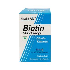 HealthAid Biotin 5000 mcg Tablet 60’s healthaid biotin 5000 mcg tablets, 60-count: a high-potency biotin supplement designed to support hair, skin, and nail health. Each tablet contains 5000 mcg of biotin, an essential B vitamin that plays a crucial role in the metabolism of proteins, fats, and carbohydrates. These tablets are ideal for individuals seeking to improve the appearance of their hair, skin, and nails. Biotin supplementation may also help maintain healthy metabolic functions. Stock up on HealthAid Biotin Tablets today for optimal results.