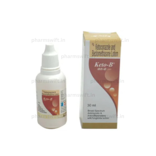 Keto-B Lotion is a dual-action formulation with ketoconazole (antifungal) and beclomethasone (steroid) used to treat fungal infections with associated inflammation, like seborrheic dermatitis, tinea, and pityriasis. It provides quick relief from itching and flaking, promoting faster healing and comfort.