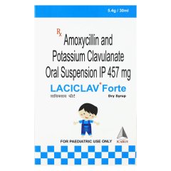 LACICLAV FORTE Syrup is a pediatric antibiotic that combines amoxicillin and clavulanic acid in a higher strength formulation. It is used for treating severe bacterial infections in children, particularly of the respiratory tract, urinary tract, and ear. The syrup is easy to administer and should be taken exactly as prescribed by a pediatrician. It works by stopping bacterial growth and overcoming resistance mechanisms. Parents should shake the bottle well before use and complete the prescribed course for the best results.