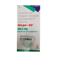 Mega CV 228.5mg Oral Suspension 30ml is an antibiotic for children containing a combination of Amoxicillin and Clavulanic Acid. It is widely prescribed to treat respiratory tract infections, urinary tract infections, ear, throat, and sinus infections caused by bacteria. This oral suspension helps in faster recovery by killing bacteria and preventing their growth. Parents should give the medicine exactly as prescribed by the pediatrician and complete the full course for best results. Shake the bottle well before use. Possible side effects include mild diarrhea, nausea, or stomach discomfort.