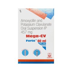 Mega CV Forte 457mg Oral Suspension 60ml is an antibiotic suspension formulated for children, containing Amoxicillin and Clavulanic Acid. It is used to treat a wide range of bacterial infections including throat, lung, ear, sinus, and urinary tract infections. The 60ml pack ensures sufficient dosage for extended treatment courses. It works by stopping bacterial growth and enhancing recovery. Parents must administer the medicine only as prescribed by the pediatrician and complete the full course. Shake well before use. Mild stomach upset or diarrhea may occur but usually resolves on its own.