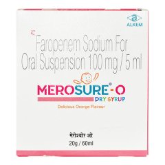 MEROSURE O Orange Flavour Dry Syrup is an antibiotic formulation designed for children, containing Meropenem to combat bacterial infections. It is used to treat infections of the respiratory tract, urinary tract, skin, and gastrointestinal tract. The orange flavour makes it palatable for children, ensuring better compliance. This syrup works by destroying harmful bacteria and preventing their growth. It is meant to be reconstituted with water before use and should be given in the exact dose prescribed by the pediatrician. Avoid self-medication and complete the full course to prevent recurrence of infection. Always shake well before each use.