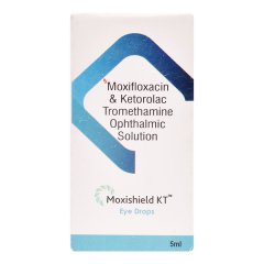 MOXISHIELD KT Eye Drops 5ml moxishield kt eye drops, a 5ml solution, is designed to provide relief for keratoconjunctivitis (kc) and bacterial conjunctivitis. This ophthalmic medication contains the active ingredient Levofloxacin, a potent antibacterial agent that targets a broad spectrum of bacteria. The drops are formulated to penetrate the corneal epithelium, ensuring effective treatment of bacterial infections in the eye. Use as directed for optimal results in managing your eye health. Consult your healthcare provider for more information on proper usage and potential interactions with other medications.