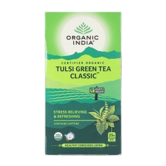 Organic India Tulsi Green Tea Classic is a blend of three types of Tulsi (Rama, Krishna, Vana) with premium green tea, offering powerful antioxidant and adaptogenic benefits. It supports natural detoxification, strengthens immunity, and enhances metabolism. Ideal for daily wellness, it calms the mind and promotes weight management. Each tea bag offers a refreshing and healthy experience.