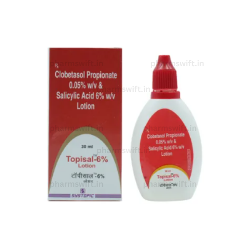 Topisal 6% Lotion is a topical keratolytic solution formulated with 6% salicylic acid, specifically designed to treat thickened, scaly, and inflamed skin conditions like psoriasis and seborrheic dermatitis. It works by exfoliating dead skin cells, reducing scaling, and promoting smoother skin texture. This lotion is commonly used on the scalp, elbows, and knees, offering effective relief from chronic flaking and irritation.