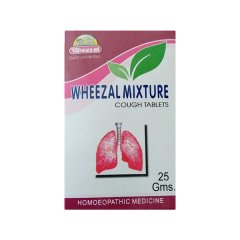 Wheezal Mixture Cough Tablet 25 gm “wheezal mixture cough tablets, 25gm, offer effective relief for persistent coughs associated with bronchitis, cold, and flu. This combination medication, containing active ingredients such as Dextromethorphan HBr, Guaifenesin, and Phenylephrine HCl, works by suppressing cough reflexes, loosening chest congestion, and narrowing dilated blood vessels in the nasal passages. Use as directed for optimal results in managing your symptoms. “