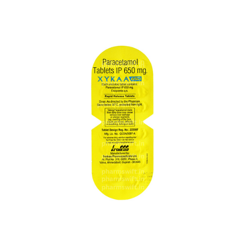 XYKAA 650 Tablet contains Paracetamol (Acetaminophen), known for its analgesic (pain-relieving) and antipyretic (fever-reducing) properties. It is effective in alleviating mild to moderate pain such as headaches, muscle aches, backaches, toothaches, and menstrual cramps, as well as reducing fever associated with common illnesses. XYKAA 650 Tablet provides a convenient oral dosage for quick and reliable relief.